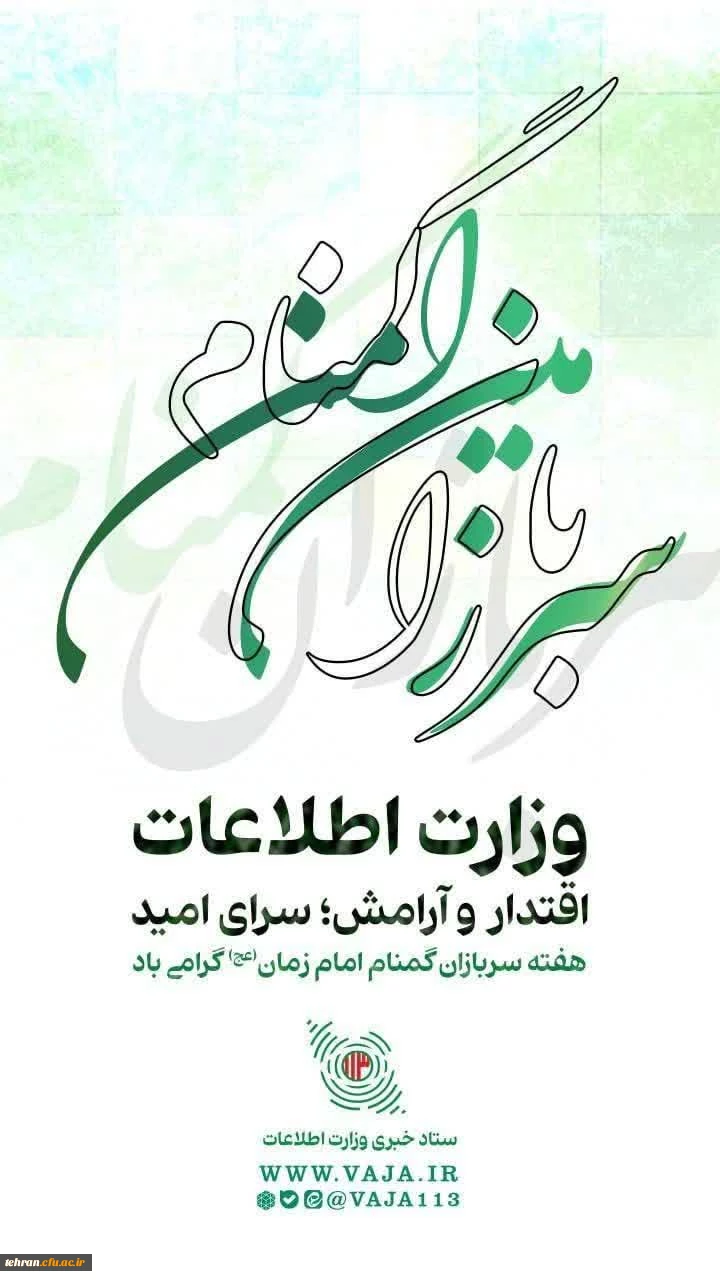 هفته سربازان گمنام امام زمان (عج) گرامی باد به مناسبت فرارسیدن هفته سربازان گمنام امام زمان (عج)، از مجاهدتهای خاموش، هوشمندانه و خالصانه کارکنان خدوم وزارت اطلاعات که با تعهد، بصیرت و ایثار، امنیت، آرامش و اقتدار کشور را پاسداری میکنند، صمیمانه قدردانی میشود. بیتردید تلاشهای بیوقفه این عزیزان در عرصه صیانت از منافع ملی، مقابله با تهدیدات و خنثیسازی توطئههای دشمنان، نقشی تعیینکننده در حفظ ثبات و امنیت جمهوری اسلامی ایران دارد. ضمن گرامیداشت یاد و خاطره شهدای والامقام عرصه اطلاعات، این هفته را به تمامی سربازان گمنام امام زمان (عج) تبریک عرض نموده و توفیق روزافزون آنان را در سایه توجهات حضرت ولیعصر (عج) و منویات مقام معظم رهبری (مدظلهالعالی) مسئلت داریم.