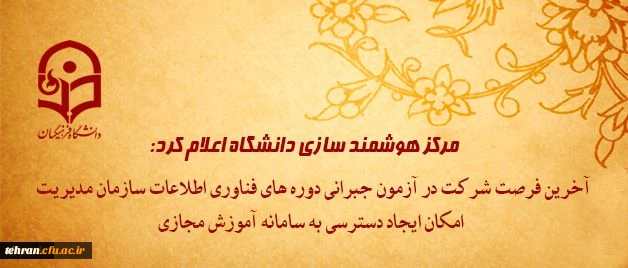 مرکز هوشمند سازی دانشگاه اعلام کرد: آخرین فرصت شرکت در آزمون جبرانی دوره های فناوری اطلاعات سازمان مدیریت و امکان ایجاد دسترسی به سامانه آموزش مجازی 2