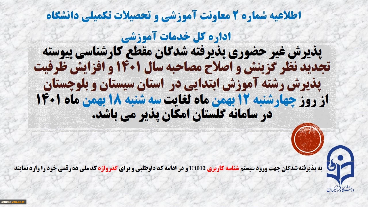 پذیرش غیر حضوری پذیرفته شدگان تاخیر گزینش و افزایش ظرفیت پذیرش استان سیستان و بلوچستان در آزمون سراسری سال 1401 2